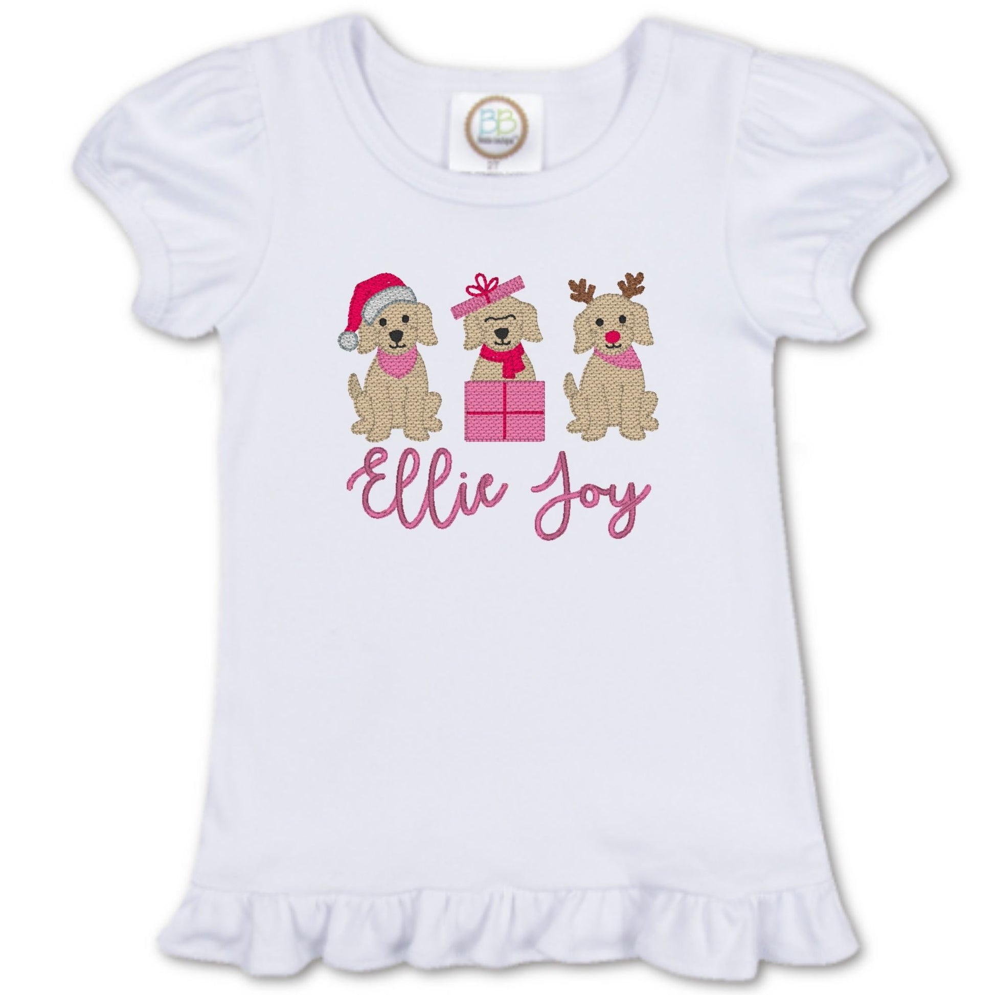 Made from soft, breathable cotton, this sweet tee features ruffled sleeves and a classic Christmas embroidery design. Add a personal touch by customizing your child’s name with your choice of font and thread color—perfect for holiday outings, family photos, and gifting.